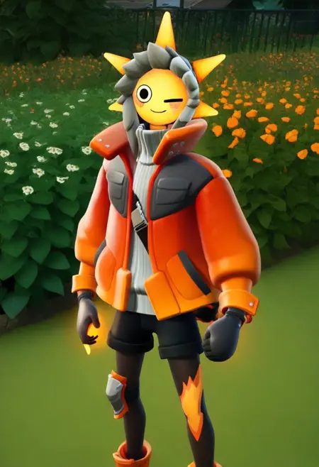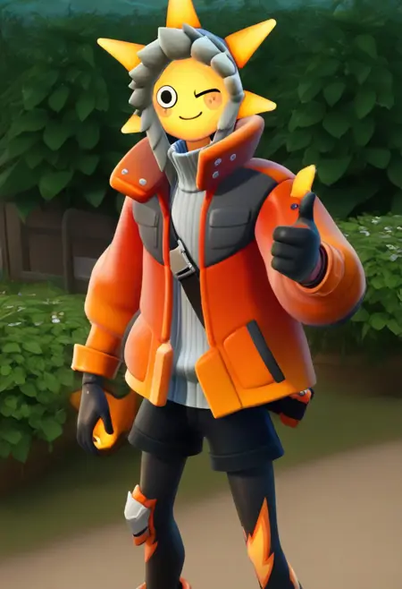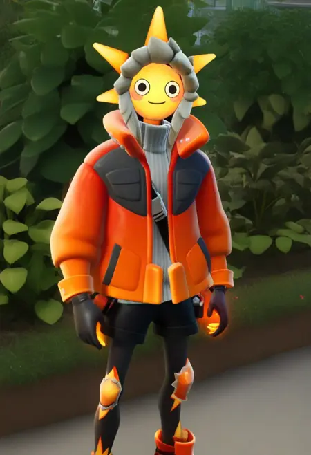 - sunspot, 빛나는 노란 피부, 태양 같은 머리, 큰 검은 점 눈, freckles이 있는 분홍색 볼, 회색 털로 된 후드, 어두운 회색 패치가 있는 주황색 풍선 자켓과 높은 칼라, 그 아래에는 밝은 회색 터틀넥 스웨터, 검은 쇼츠, 검은 손가락 없는 장갑, 불 무늬가 있는 검은 타이츠, 회색 털이 있는 주황색 무릎 패드, 흰 끈과 밑창이 있는 주황색 하이탑 부츠, 몸통을 가로지르는 대각선 벨트에 주황색 수류탄 두 개가 달려 있음