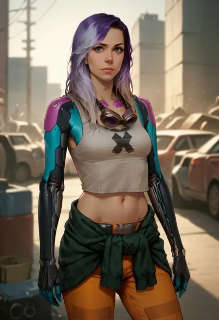 goggles around neck, tank top, sleeveless, midriff, clothes around waist, orange pants, boots,