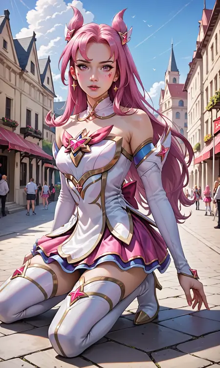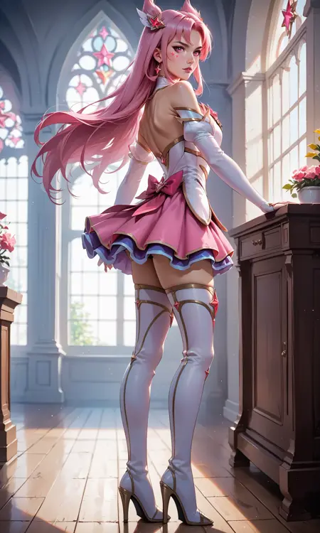lora:SGKaisaSDXL:0.75, (star guardian kaisa, thighhighs, pink hair, long hair, hair ornament, pink eyes, elbow gloves, fingerless gloves, thigh boots, full body),
