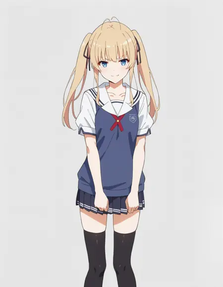 듀얼 테일스, 검은 리본, 학교 복장, 파란 스웨터 조끼, 세라후쿠, 검은 허벅지 화이트, 접힌 치마, 짧은 소매, 해적 칼라