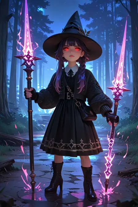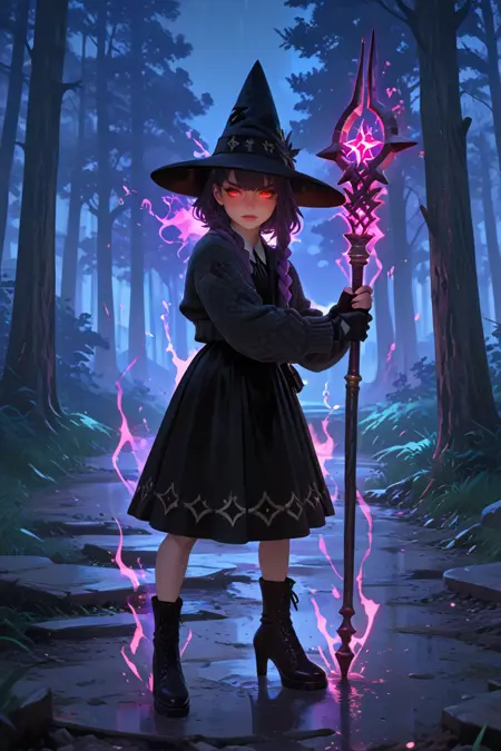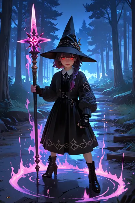 "NITESHADE" 风格:紫发,黑色帽子,黑色连衣裙,深灰色开衫,露指手套,黑色高跟靴