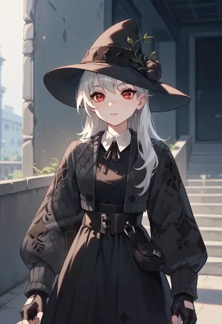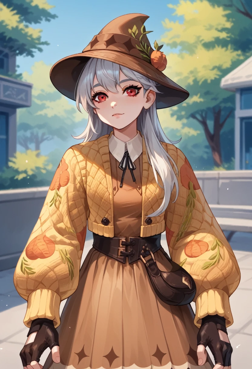 "LEXA HEXBRINGER" 风格:白发,棕色帽子,棕色连衣裙,黄色开衫,露指手套,棕色高跟靴