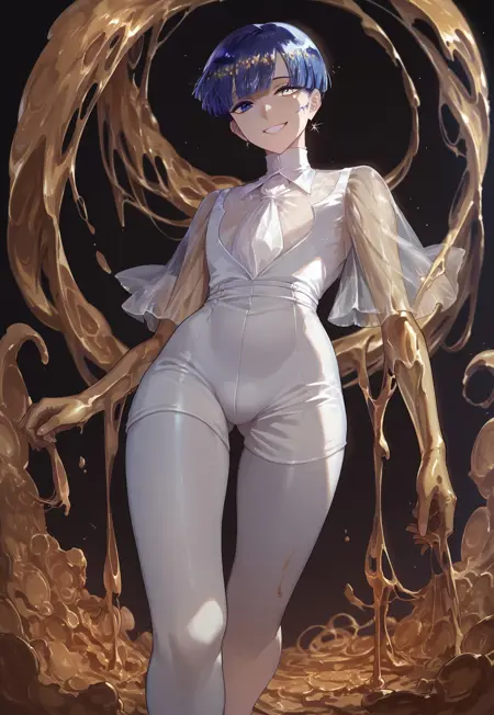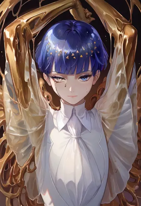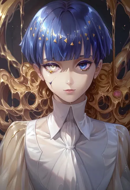 PhosllXL,androgynous, heterochromia, white eye, blue eye, blue hair, crystal hair, short hair, blunt bangs, golden arms