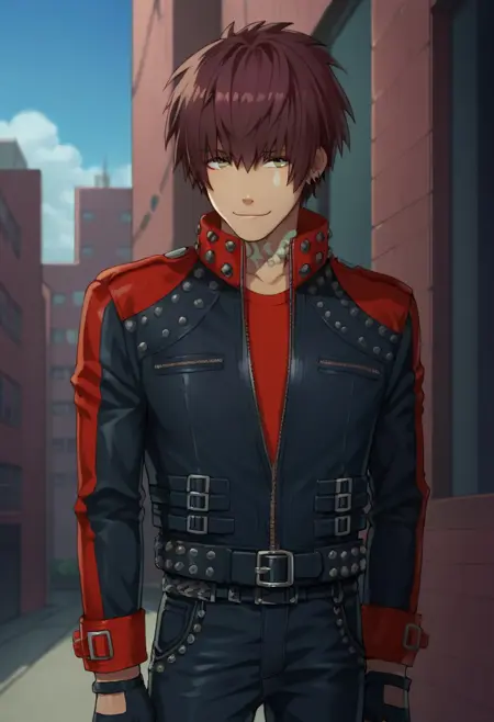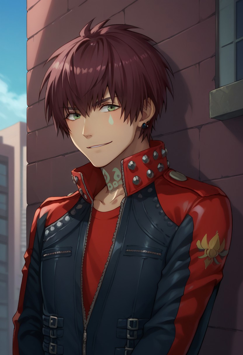 mizuki, 1boy, male focus, solo, brown hair, green eyes, tattoo, facial tattoo, neck tattoo, jewelry, earrings, jacket, leather jacket, red jacket, black jacket, multicolored jacket, gloves, shirt, red shirt, black gloves, fingerless gloves, belt, pants, black pants, boots, red footwear,