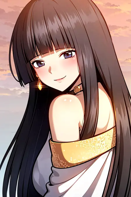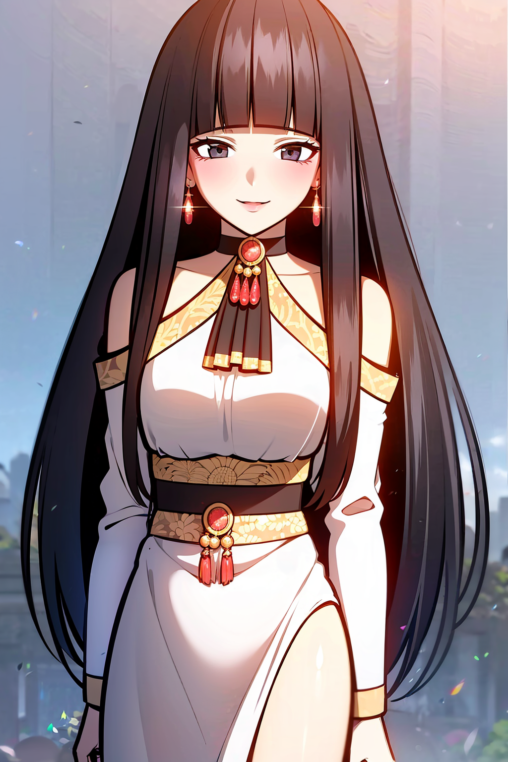 1girl, solo, black hair, long hair, blunt bangs, grey eyes, blush, off shoulder, white dress, collar, earrings