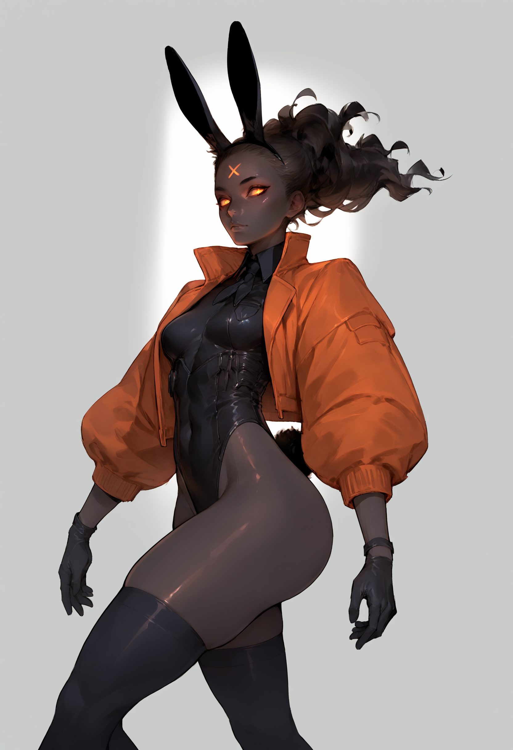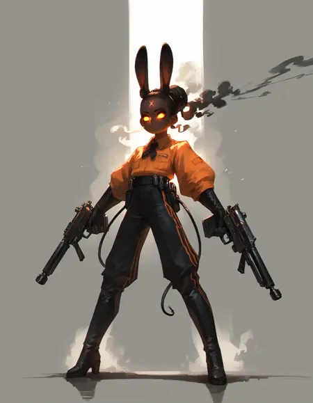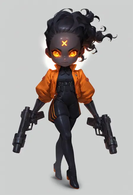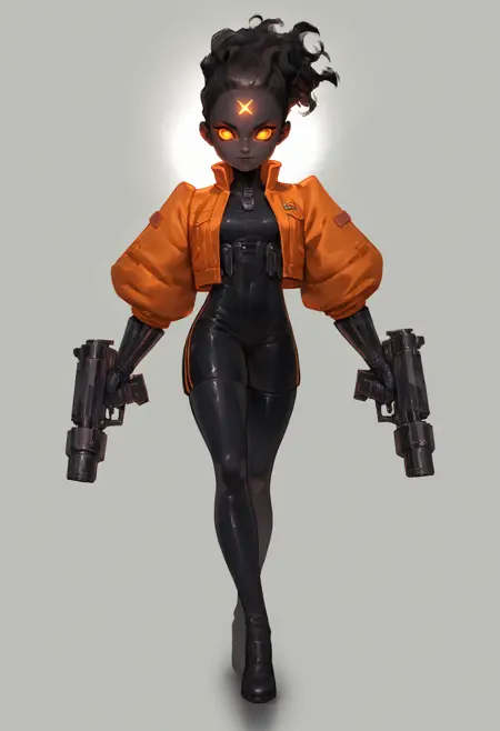 Helpers: orange glowing forehead_mark, black_skin, colored_skin, pistols,orange jacket, smoky