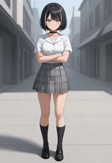 eimiazai, short hair, black hair, grey eyes, streaked hair