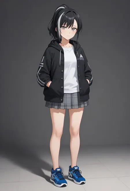grey eyes, streaked hair, black hair, ponytail, shika_s