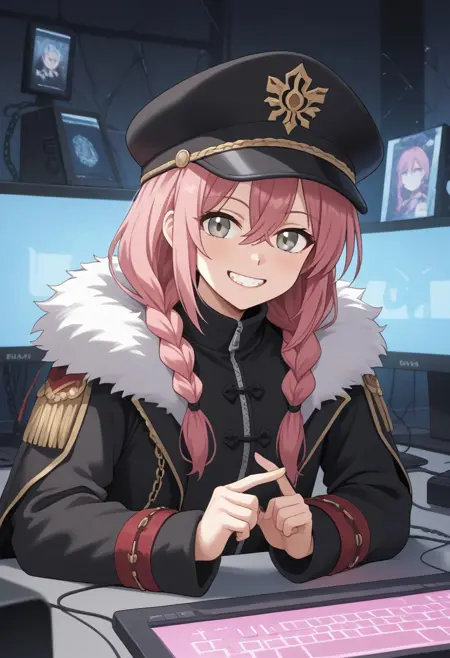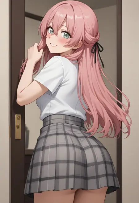 bbessyo, pink hair, long hair, grey eyes, hair between eyes