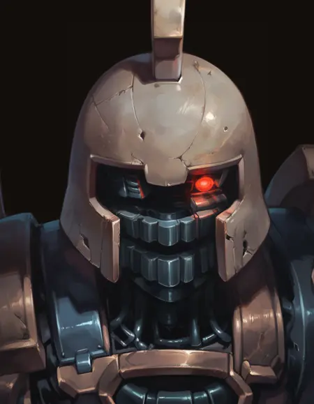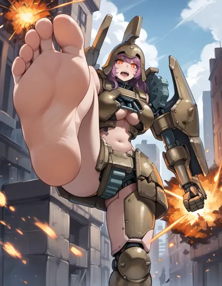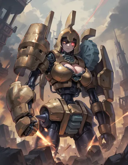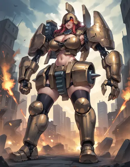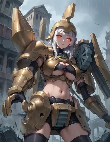 Tags (character- type C): ancient gear golem, 1girl, mecha musume, personification, navel, bronze armor, bronze helmet, large breasts, underboob, midriff, cleavage, giantess, orange eyes, glowing eye