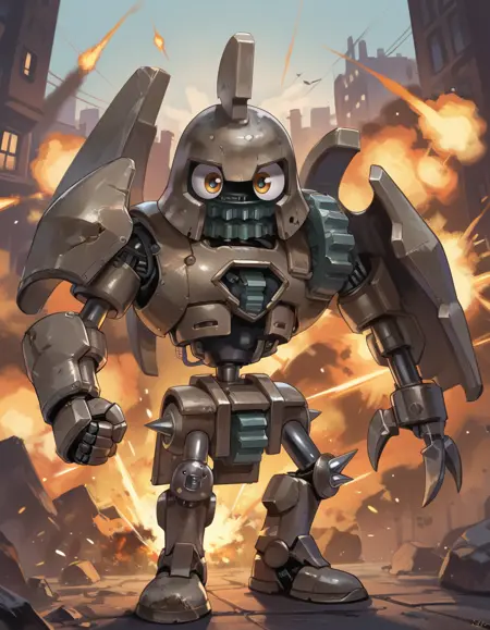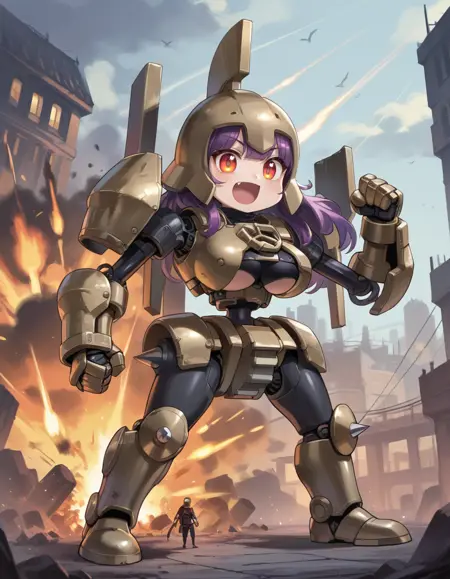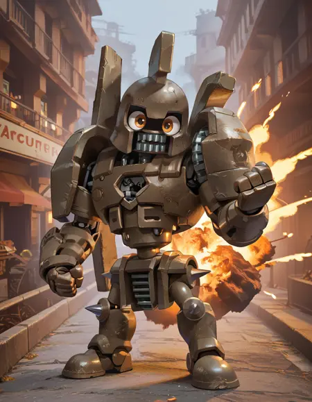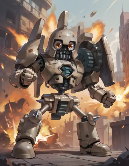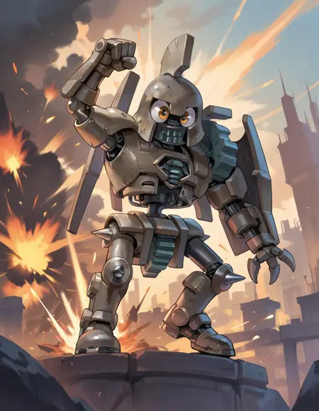 Tags (character- type B): ancient gear golem, robot, no humans, clenched hand, giantess, chibi, orange eyes