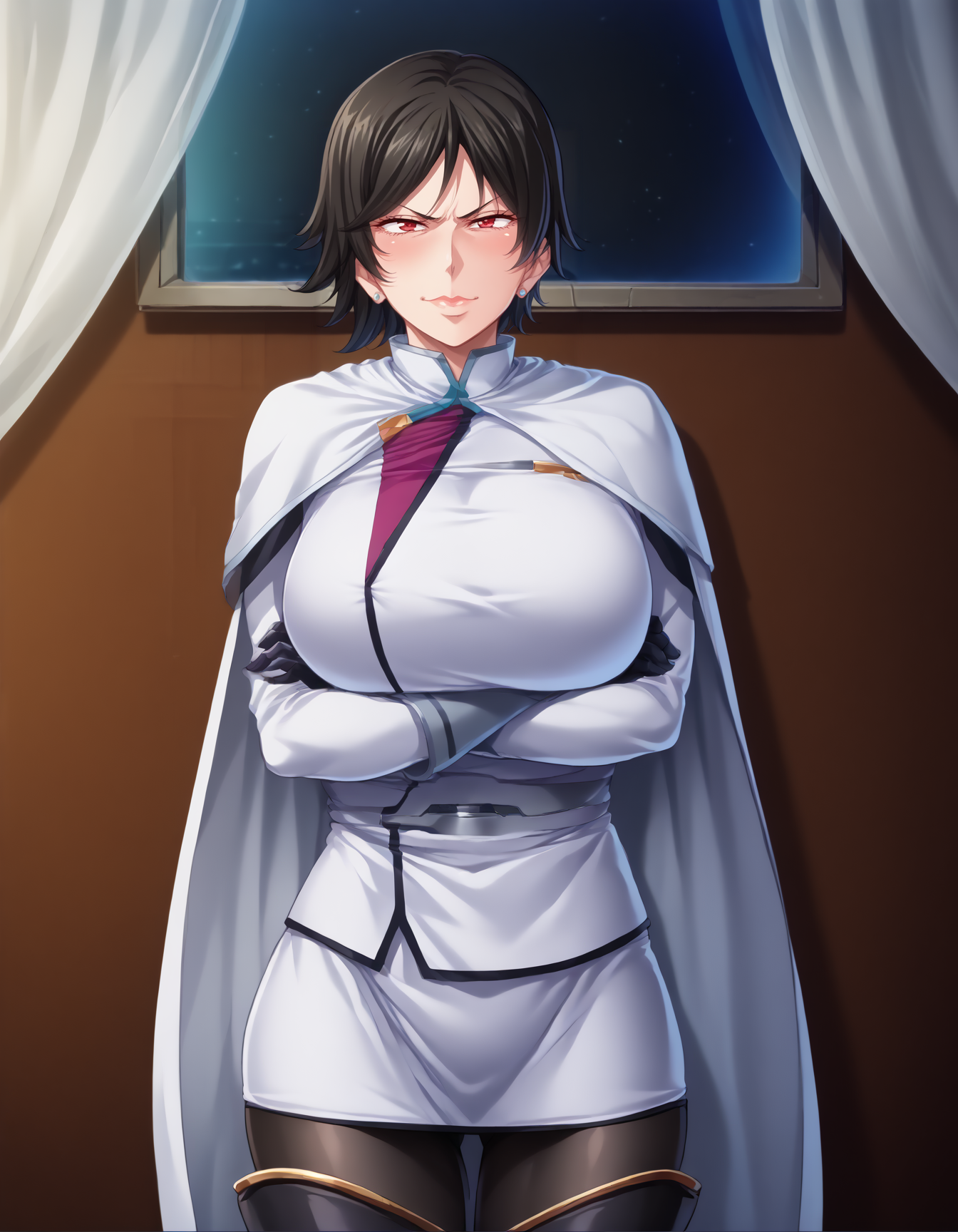 朱莉娅·布洛德斯通, 1girl, 成熟女性, 黑发, 短发, 红眼, 巨乳, 粉色口红