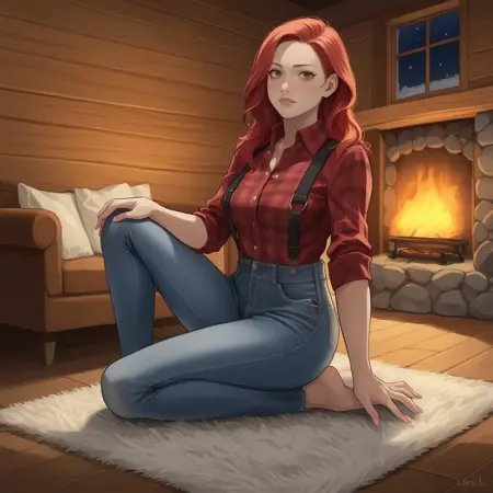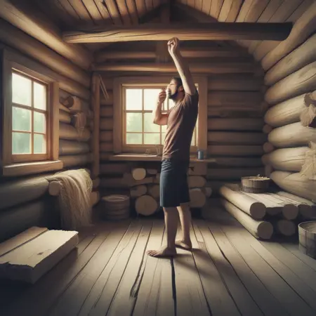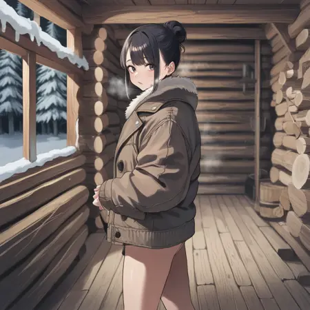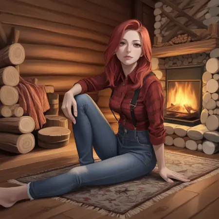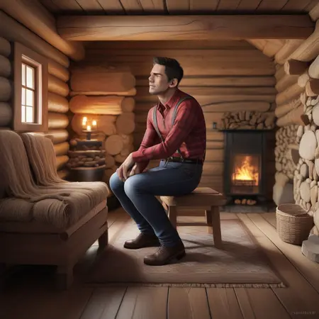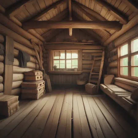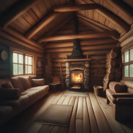 オプション:室内、木製の床、ログ壁、レトロ調、暖炉、ラグ