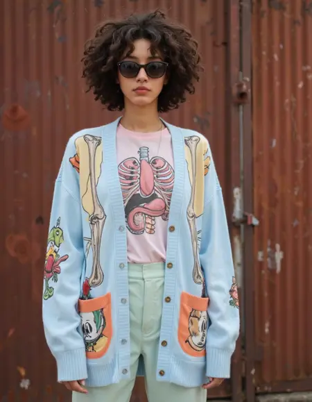 さまざまな衣料品と組み合わせると良好な効果を発揮します。セーターのような質感が明確な素材や、リアルな刺繍や編み込みで臓器の図形を表現するとさらに効果的です。