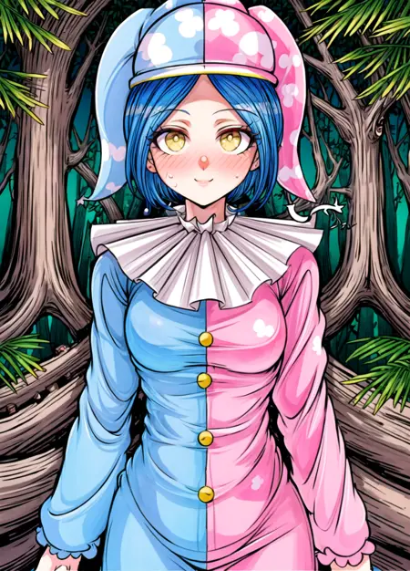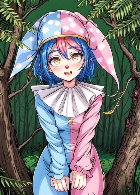 Standard clown outfit: short hair, 1girl, Satsuki Iranami, clown nose, jester's cap, Danganronpa Another uniform, blue, pink, two-toned jester outfit, two toned jester outfit, one half blue, one half pink, two toned jester cap, two-toned jester cap, blue and pink jester cap, yellow eyes, white ruffled collar, yellow buttons, curled shoes