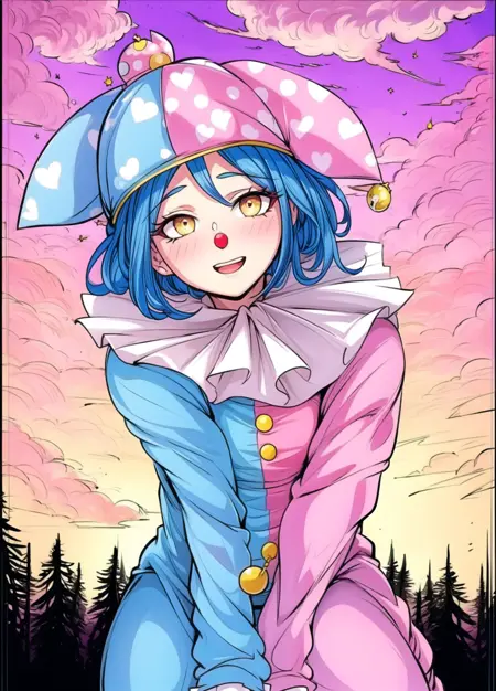 표준 클라운 복장: short hair, 1girl, Satsuki Iranami, clown nose, jester's cap, Danganronpa Another uniform, blue, pink, two-toned jester outfit, two toned jester outfit, one half blue, one half pink, two toned jester cap, two-toned jester cap, blue and pink jester cap, yellow eyes, white ruffled collar, yellow buttons, curled shoes