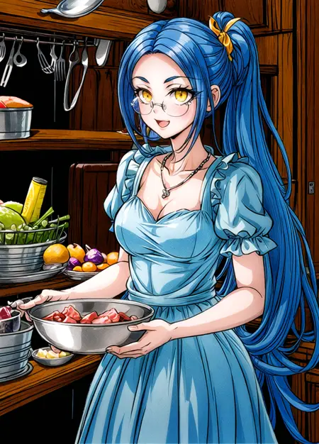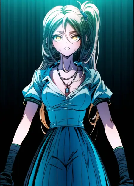Formal dress: Satsuki Iranami, 1girl, Danganronpa Another dress, yellow eyes, light blue dress, puffy short sleeves, low neckline, necklace, pendant, blue hair, ponytail, white gloves