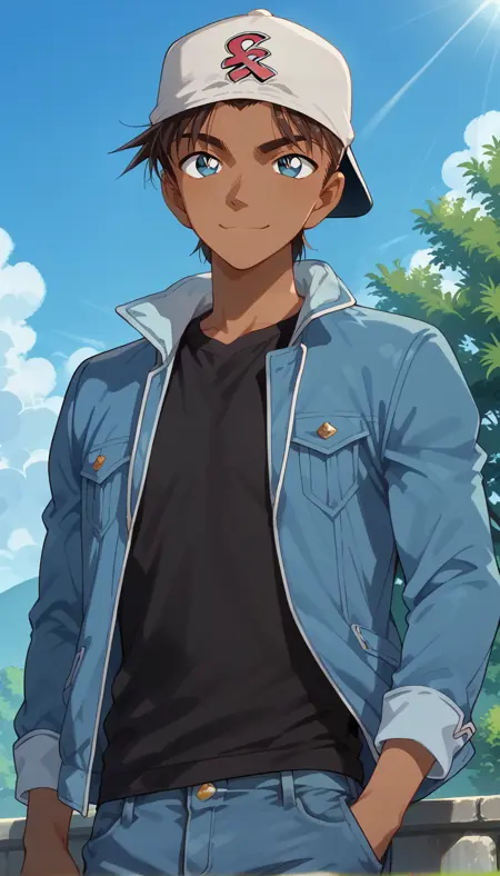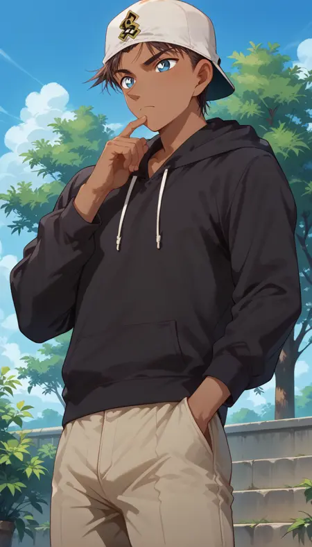 1个男孩,单人,青少年,男性聚焦,lora:Hattori_Heiji,Heiji Hattori,深色皮肤,蓝眼睛,深棕色短发