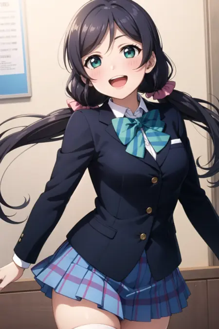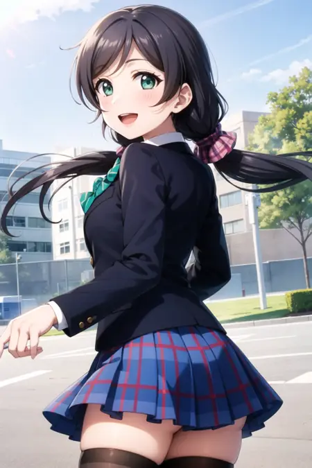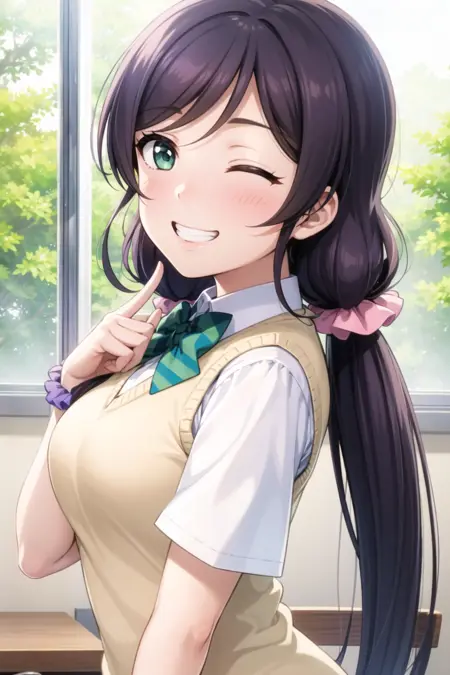 필요한 태그: 1girl, solo, toujou nozomi, green eyes, long hair, low twintails, scrunchie