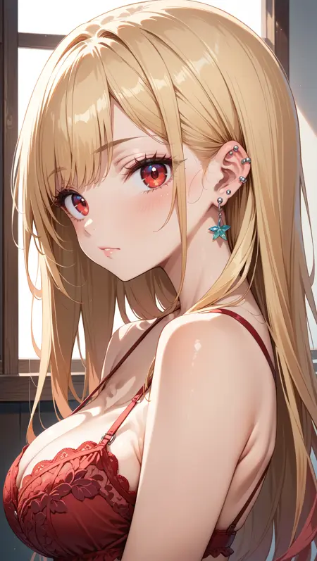 1girl, marin kitagawa,blonde hair, medium to big breasts, red eyes, ear piercing, barbell piercing, earrings,