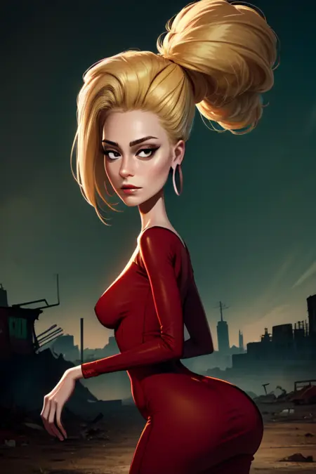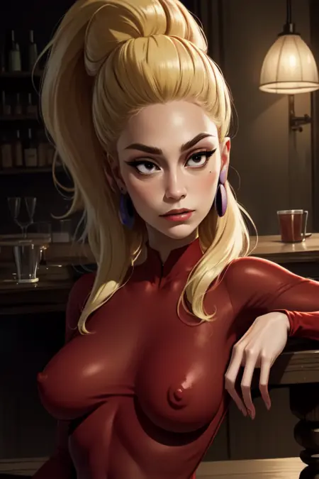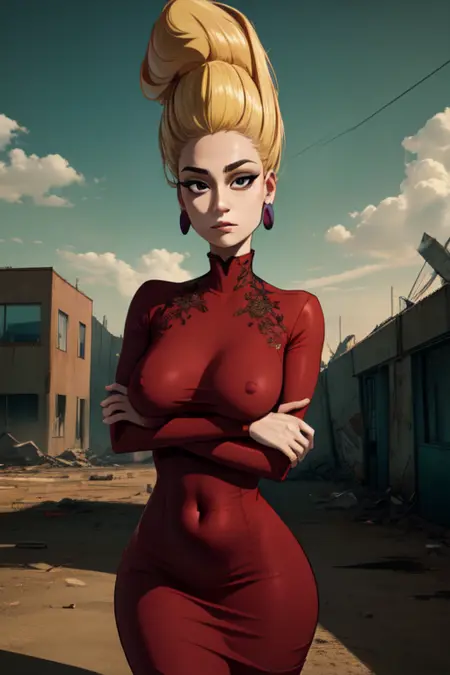 hair may be tricky to prompt - certain styles make it more accurate (but her hair is a wig so swapping hair styles is fine as her being bald is canon) - works better with 2d/cartoon styles - as they may not give her a nose