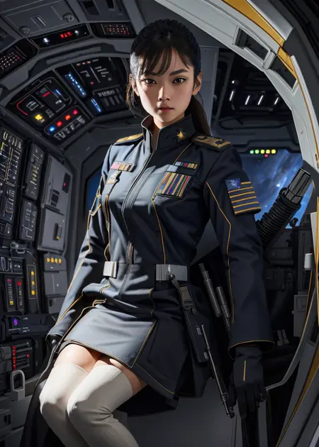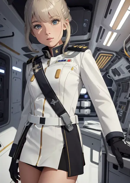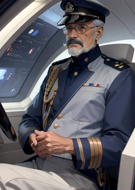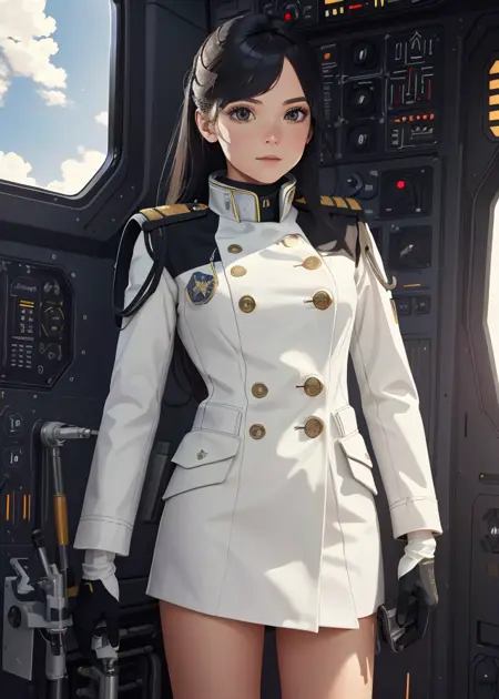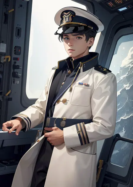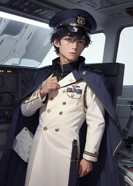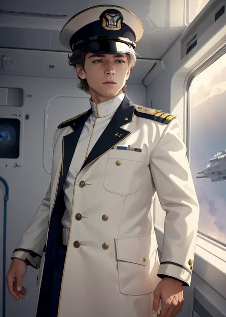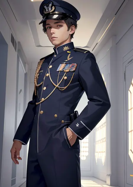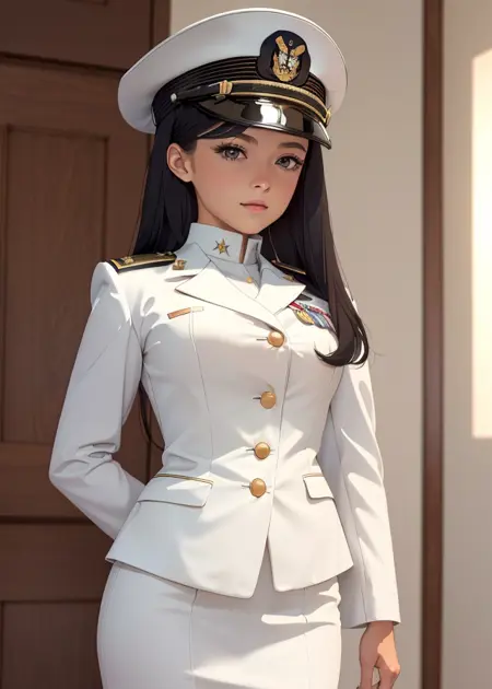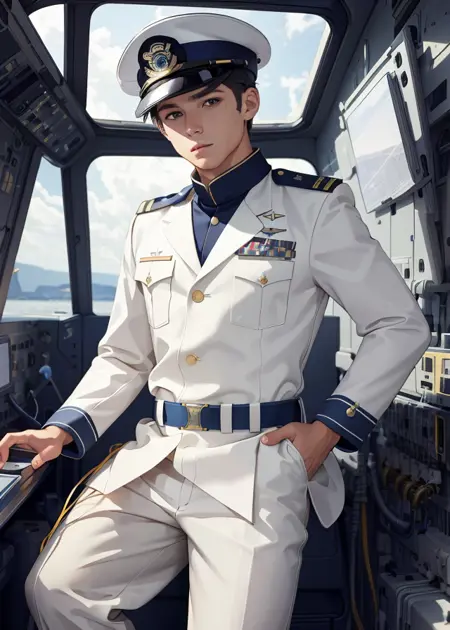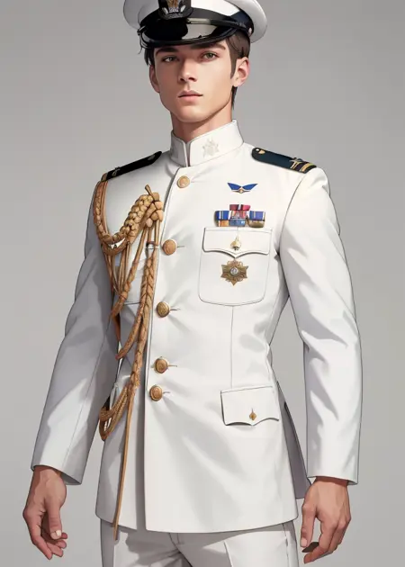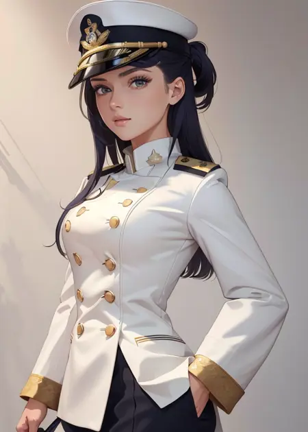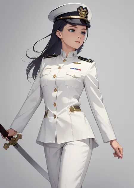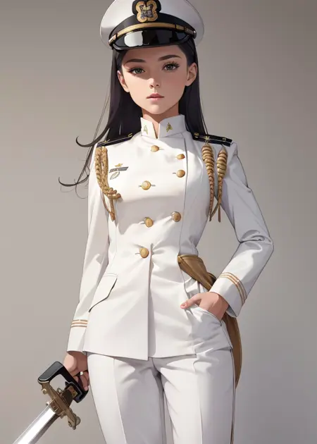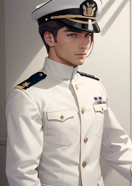 white military uniform, uniform, military, military uniform, solo, hat, pants, military hat, long sleeves, naval uniform, white pants, peaked cap, looking at viewer