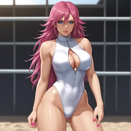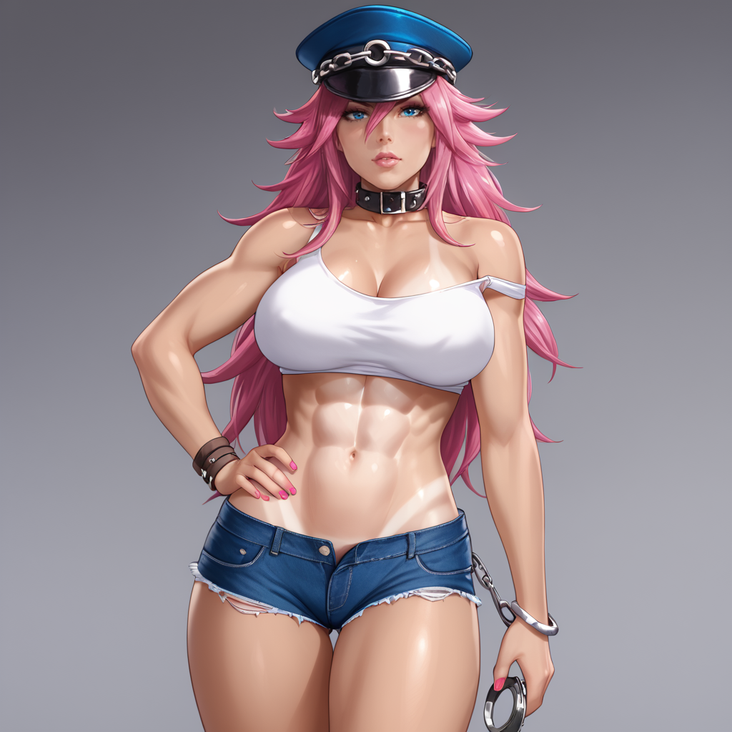 트리거: PoisonStreetFighter, 1girl, 손목쇠사슬, 분홍색 머리카락, 모자, 데님 반바지, 큰 가슴, 뾰족한 모자, 쇠사슬, 복근, 햇빛에 탄 자국, 배꼽, 크롭탑, 파란 반바지, 긴 머리, 짧은 반바지, 입술, 스파이크 목걸이, 근육질, 보석, 손톱 물감, 파란 눈, 열린 지퍼, 복부, 팔찌, 탱크탑, 메이크업, 가슴선, 분홍색 손톱, 컷오프, 어깨끈 미끄러짐, 체인, 초커