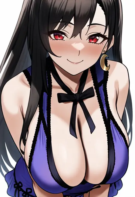 Refined dress : 1girl, tifardress, black hair, long hair, red eyes, bangs, bare shoulders, cleavage, purple dress, short dress, crescent earrings, ribbon, sleeveless, high heels