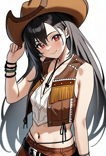 Cowgirl prompts : 1girl, tifacogi, black hair, long hair, bangs, red eyes, cowboy hat, brown cropped vest, sleeveless, bare shoulders, belt, bracelet, brown skirt, midriff, navel, black boots