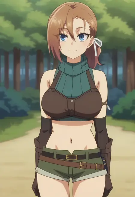 ouftit 1: bare shoulders, navel, crop top,brown gloves, white ribbon, sleeveless turtleneck, green shirt, elbow gloves, short shorts, brown belt,midriff