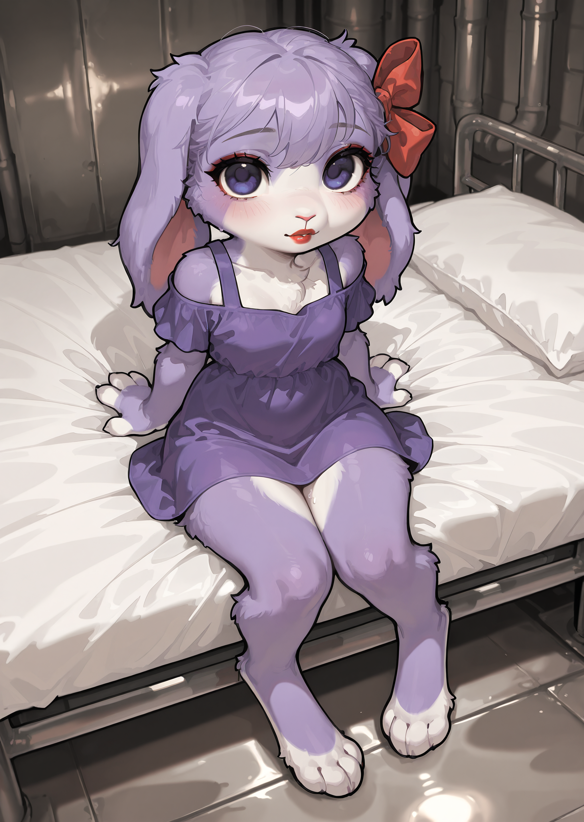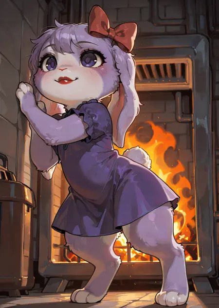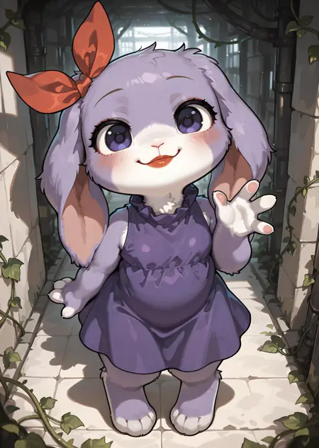 furry, rabbit, short lop ears, red lips, red bow, purple dress