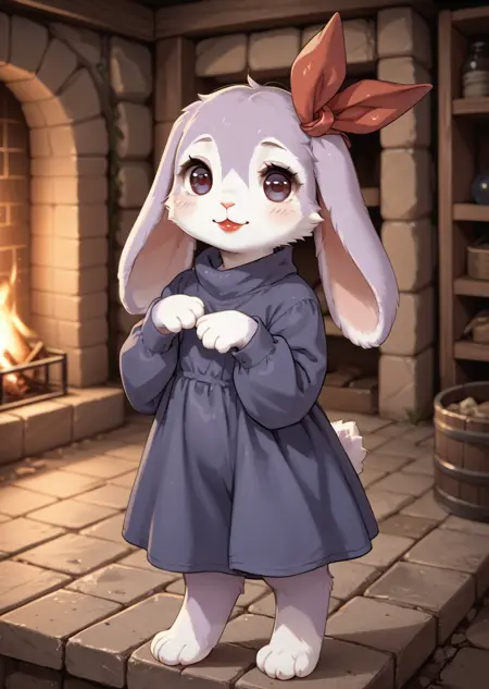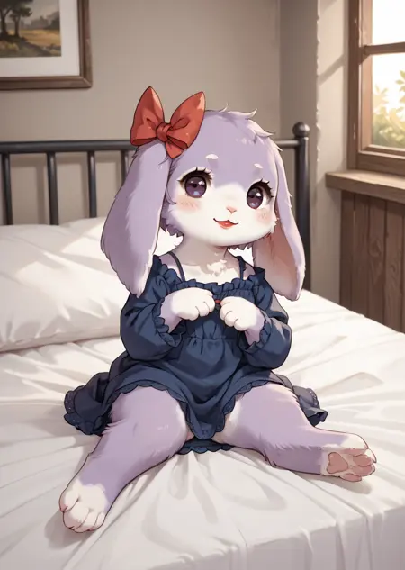 furry, rabbit, short lop ears, red lips, red bow, purple dress