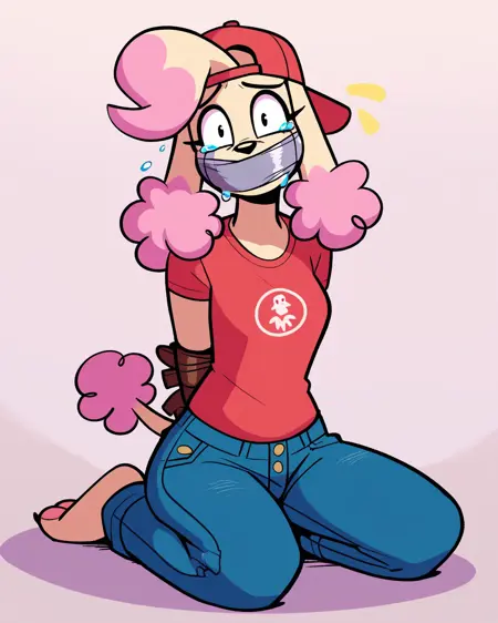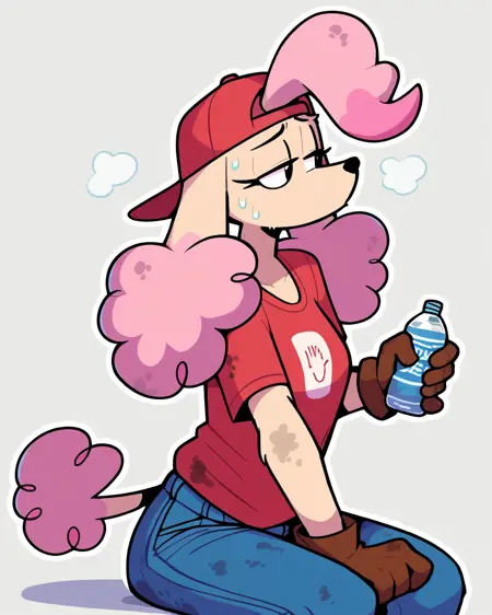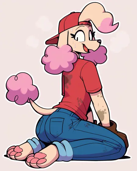 トリガーワード: ピンクのハイライト、ファーの女性、プードル、女性、ファー、赤い野球帽、野球帽、逆さの野球帽、グローブ、手袋、赤いシャツ、赤いTシャツ、Tシャツ、ジーンズ、尾