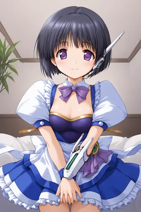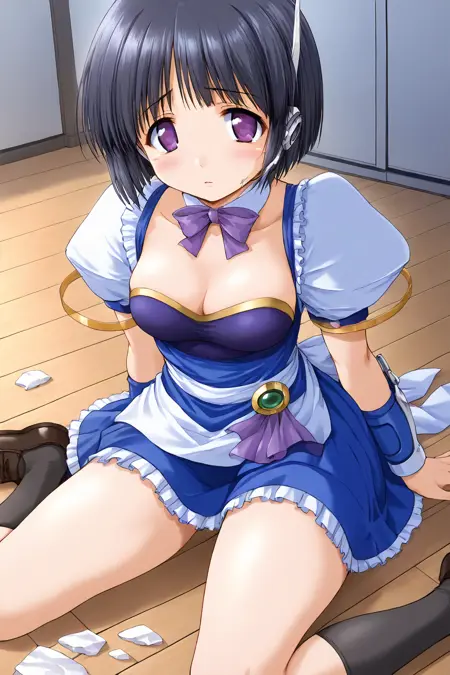 waitress, detached collar, ribbon, bow, purple bowtie, armor, dress, blue dress, short dress, frills, puffy short sleeves, white sleeves, arm ring, waist apron, white apron, frilled apron, brooch, jewelry, back bow, white back bow, skirt, frilled skirt, blue skirt, pleated skirt, robot ears, wristband,