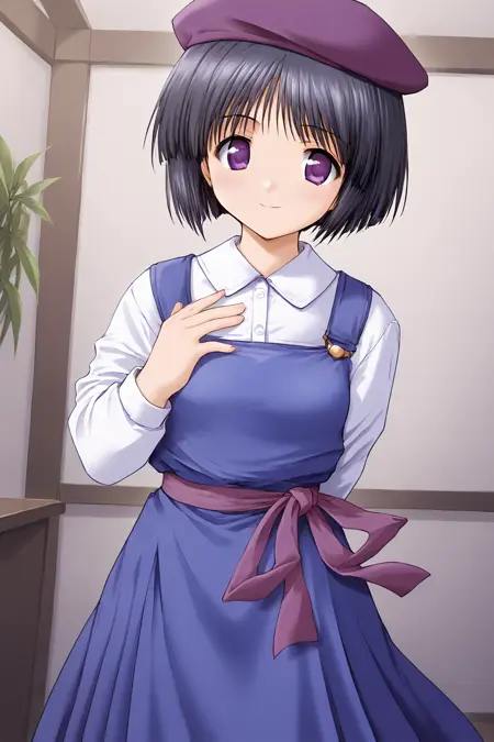 hat,beret,purple headwear,pinafore dress,sleeveless,sleeveless dress,purple pinafore dress,shirt,white shirt,long sleeves,collared shirt,dress shirt,buttons,ribbon,bow,sash,