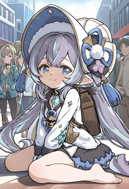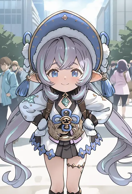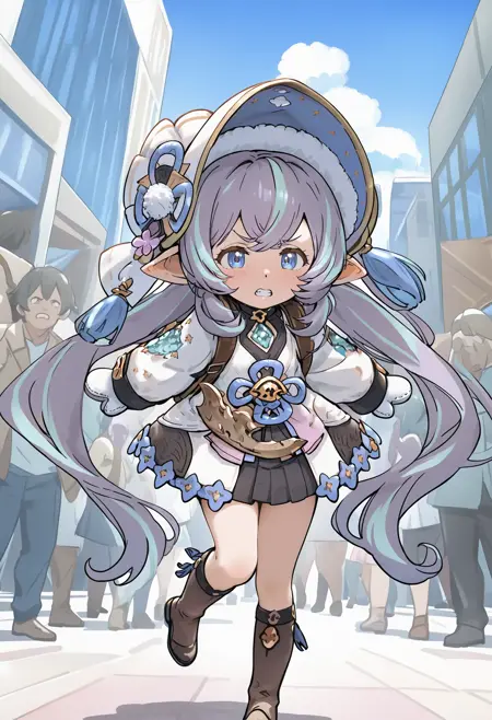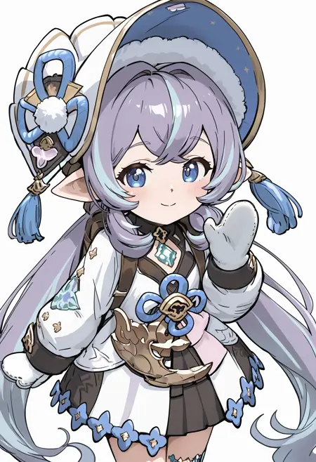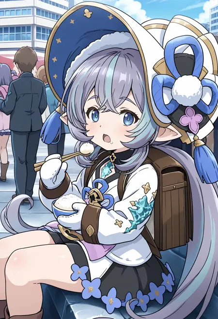uruki \(granblue fantasy\), harvin, purple hair, multicolored hair, low twintails, blue eyes, bonnet, hat tassel, dress, long sleeves, mittens, backpack, footwear,