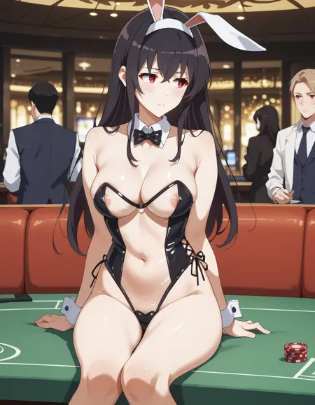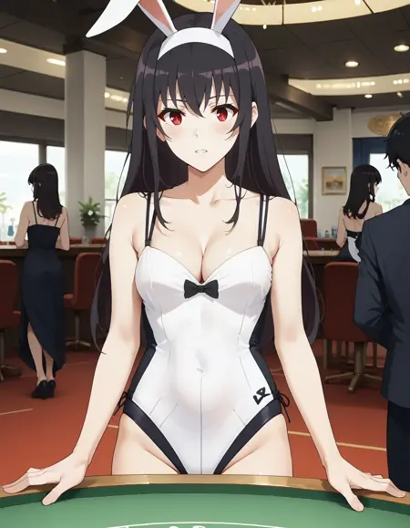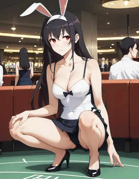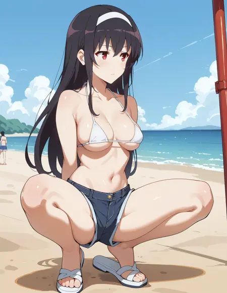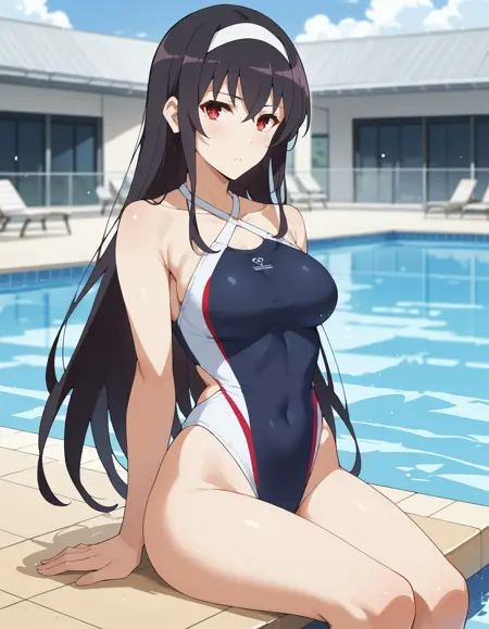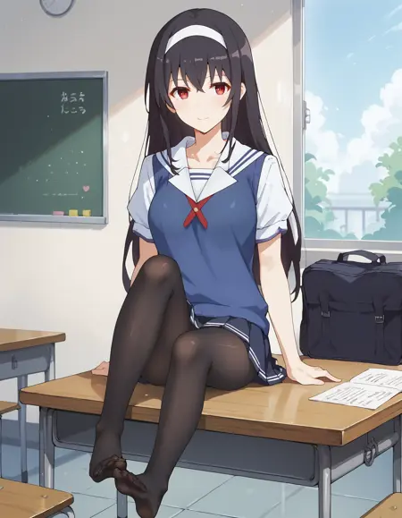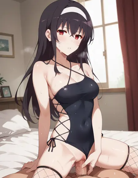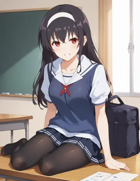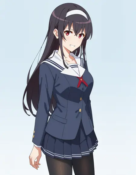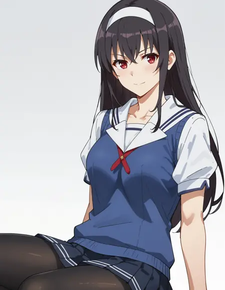 1girl, utaha lora:Kasumigaoka_Utaha:1, 검은 머리, 카스미가오카 우타하, 긴 머리, 흰색 헤어밴드, 빨간 눈, 중간 사이즈 가슴