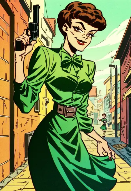 标签:瓦莱丽·沃恩,棕发,短发,红唇。她最常穿的服装是“绿色上衣、绿色裙子、腰带、蝴蝶结”。