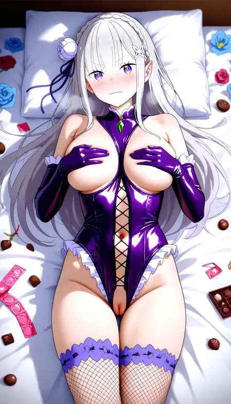 胸元のないフリル付きジュレオタードで、前面に目立つ開口部があり、手袋、フィッシュネットの太ももハイ、ストラップサンダルと合わせて着用。