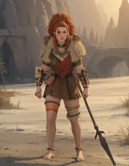 KaterinadeHansebourg, tribal, pelt, jewelry, facepaint, holding spear, green eyes,