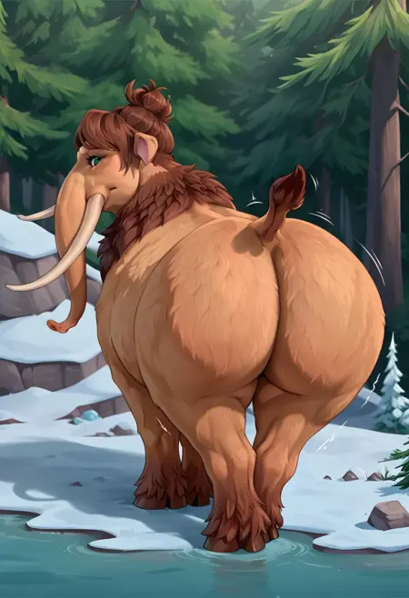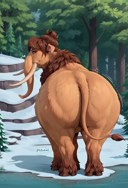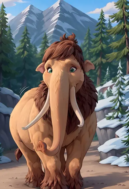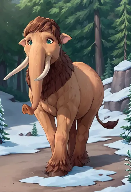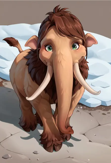 Peaches (Ice Age), mammoth, elephant, light brown fur, brown hair, green eyes, horse tail, long bangs, trunk, tail,