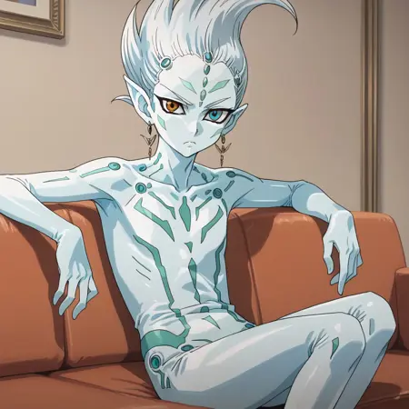 astral_yz, white hair, colored skin, heterochromia, earrings, pointy ears