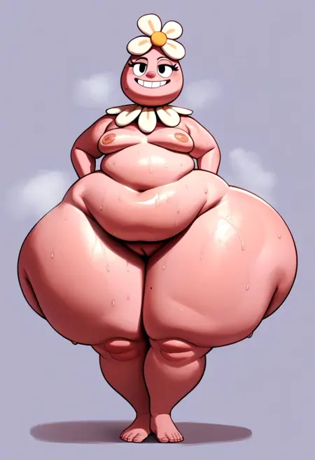 FoofaYGG, 1girl, pink body, huge flower on head, light pink petals, yellow stigma in the middle, light pink petals around neck, rounded body, black eyes, chubby, fat,