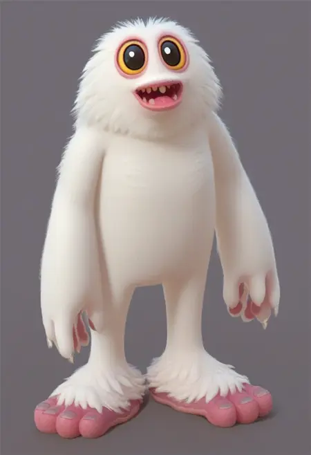 Mammott_MSM, black eyes, yellow sclera, colored sclera no humans, white fur, anthropomorphic, creature, monster, no eyebrows, yeti, big eyes, big mouth