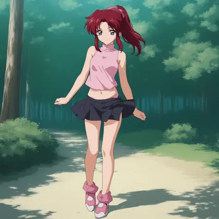 2 - socre_9, score_8_up, score_7_up, (masterpiece, best quality:1.4), 1girl, 20歳, flay allster, ソロ, source_anime \(gundam seed\), 暗赤髪, 青灰色の目, ポニーテール, 白とピンクのノースリーブシャツ, 横に結び目, 黒の短いスカート, おへそ, ピンクの靴, 立ち姿, 森