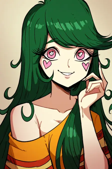 duleena duneeda, green hair, very long hair, pink eyes, heart, off shoulder shirt, shorts, red kneehighs