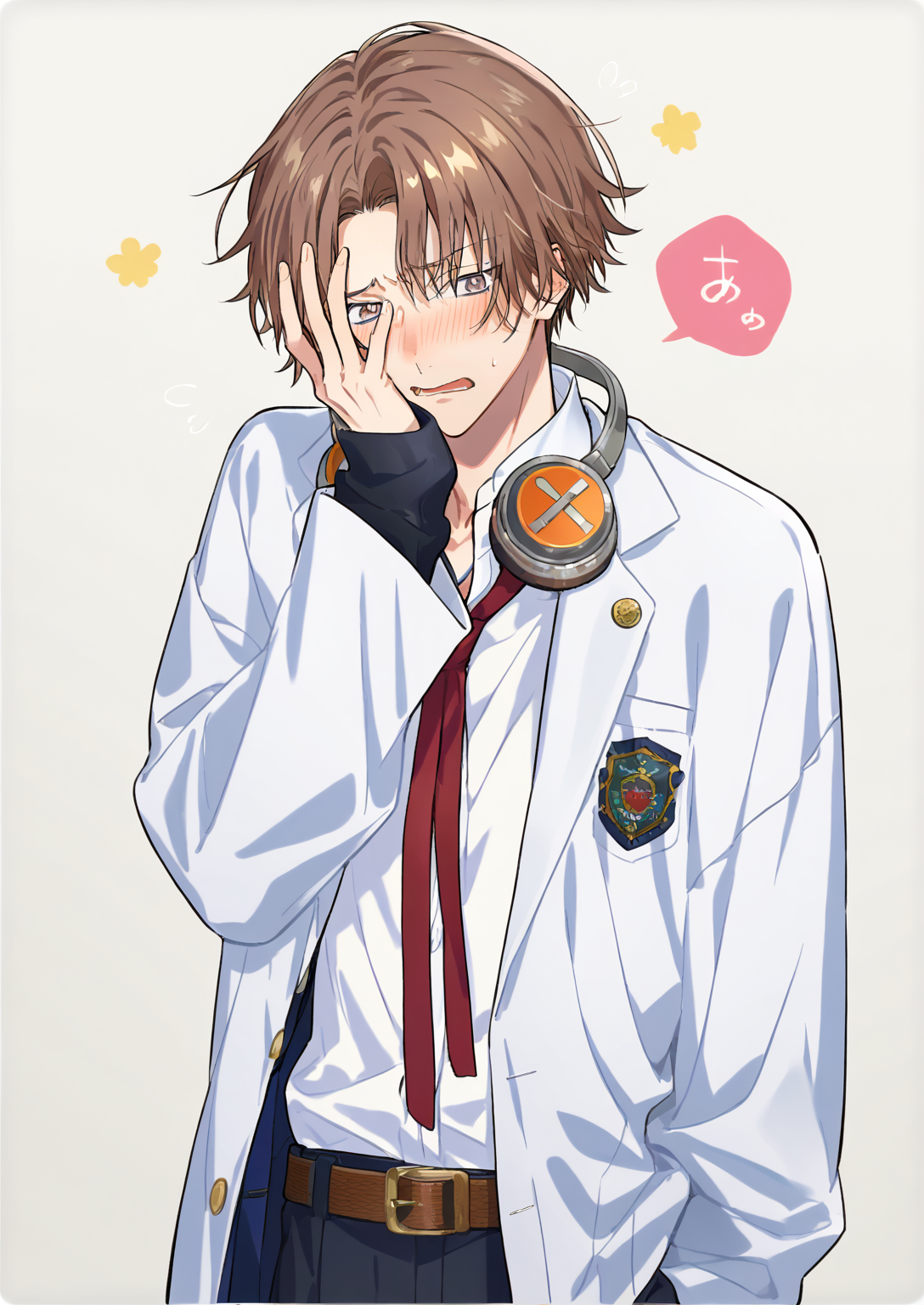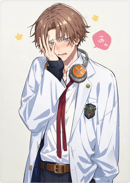 学校制服、首にヘッドホンをかけている、コート、長袖、赤いリボン、ベルト、白いシャツ、(白いコート)+(黒い袖)