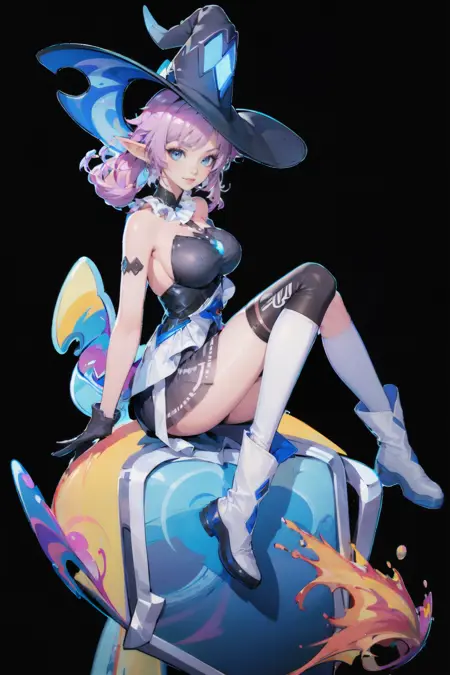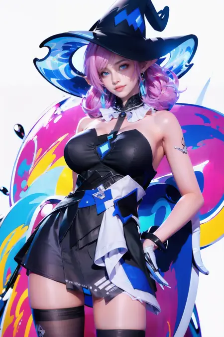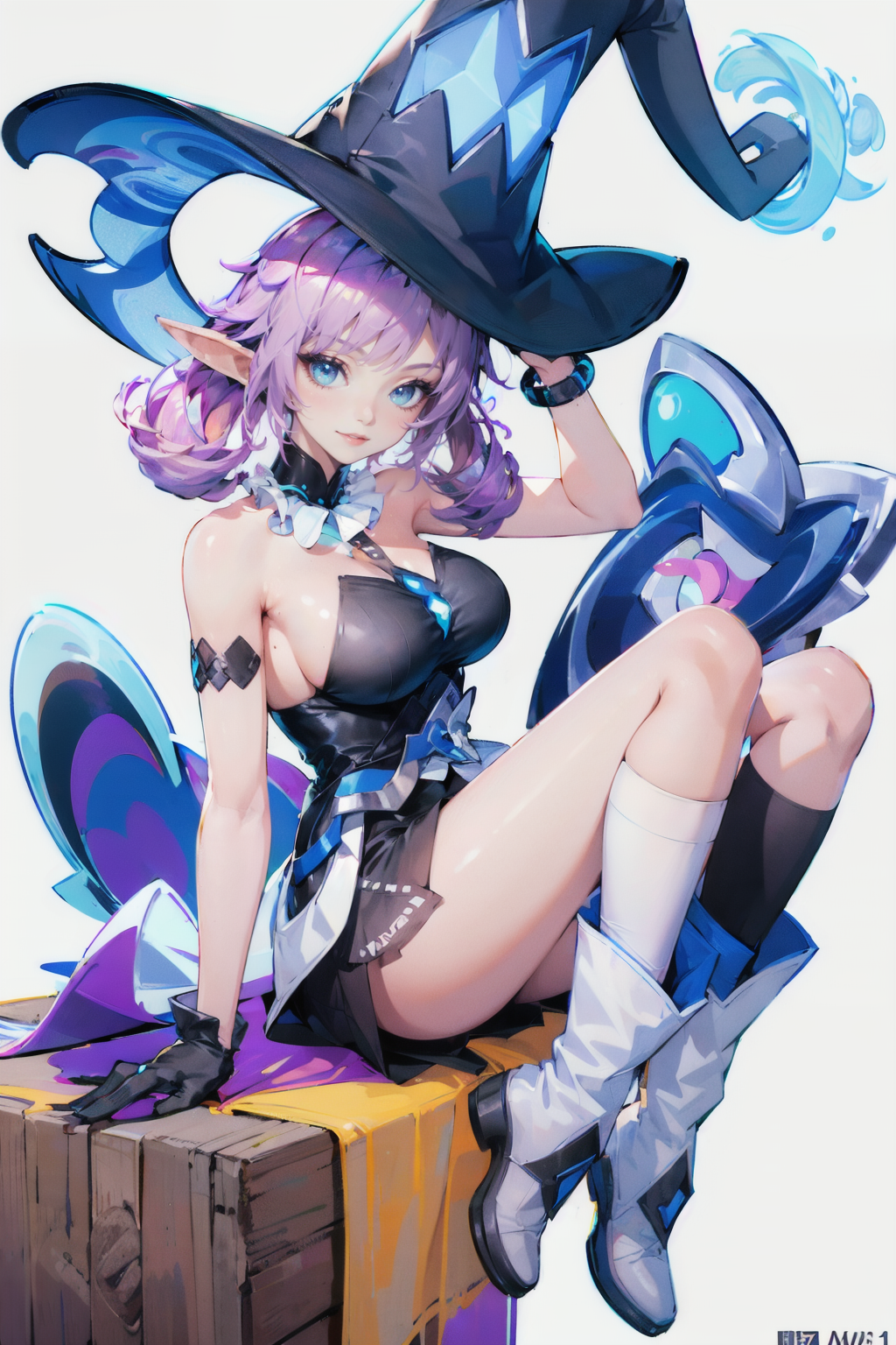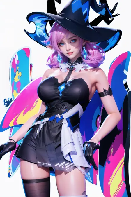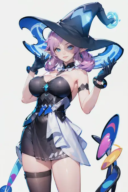 提示词:Veera_WCH, 1girl, solo, hat, witch hat, black headwear, pink hair, bangs, pointy ears, looking at viewer, blue eyes, mole, mole under eye, closed mouth, bare shoulders, breasts, large breasts, sideboob, dress, strapless, strapless dress, black dress, gloves, skirt, legs, asymmetrical legwear, thighhighs, single thighhigh, black thighhighs, socks, boots, white footwear, jewelry