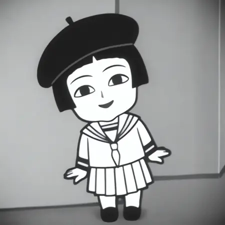 Chameko, 1girl, monochrome, grayscale, black bobcut, blunt bangs, black eyes