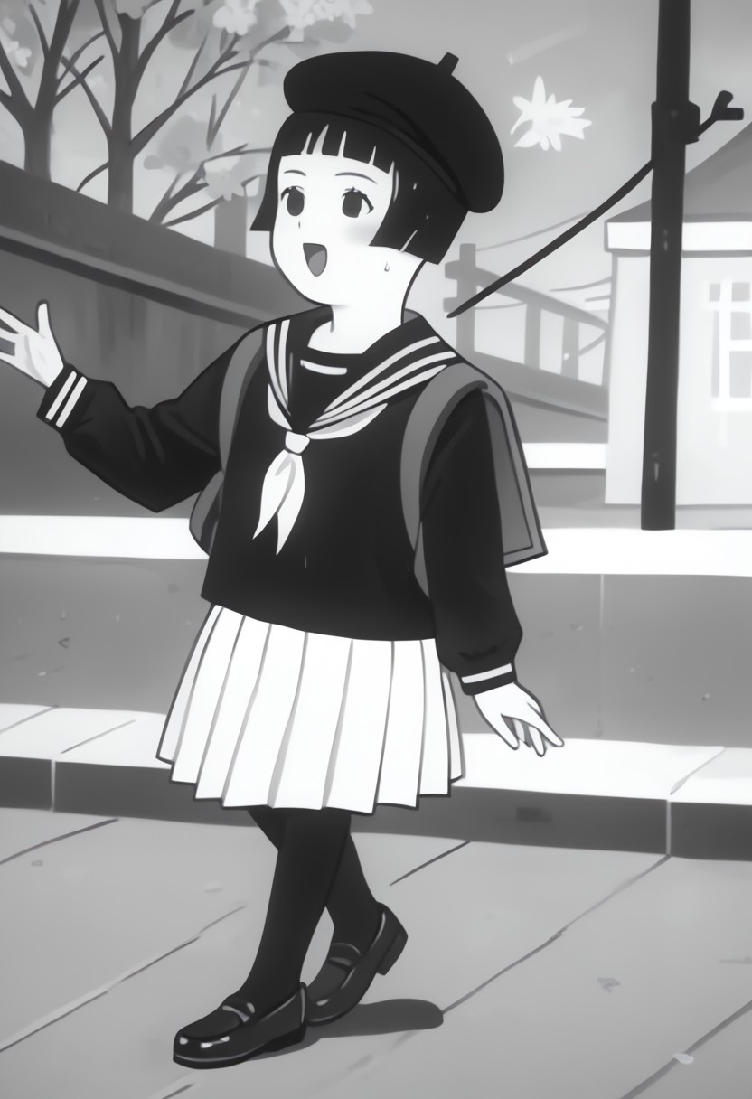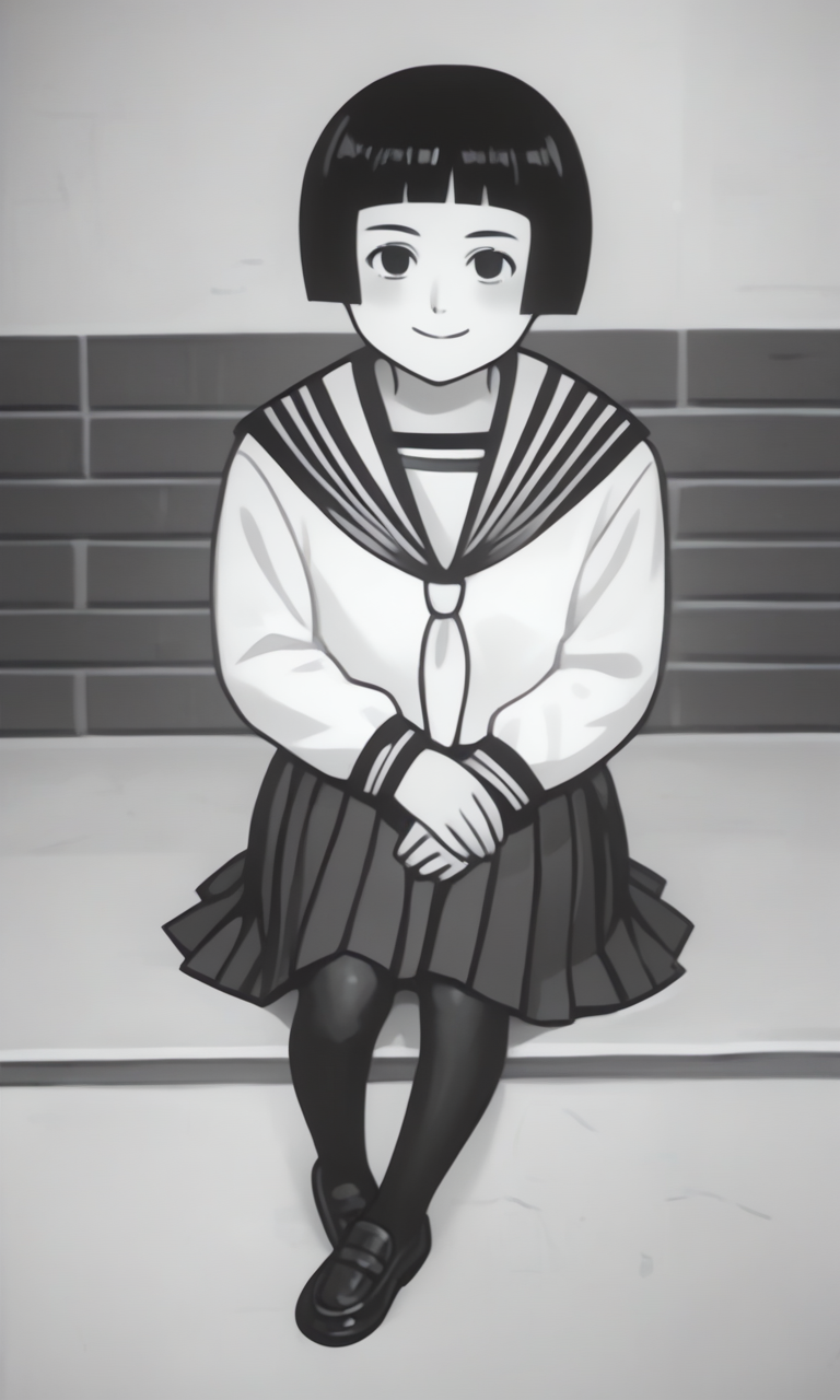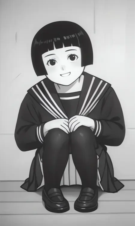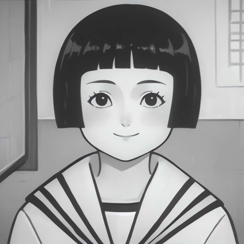 Chameko, 1girl, monochrome, grayscale, black bobcut, blunt bangs, black eyes